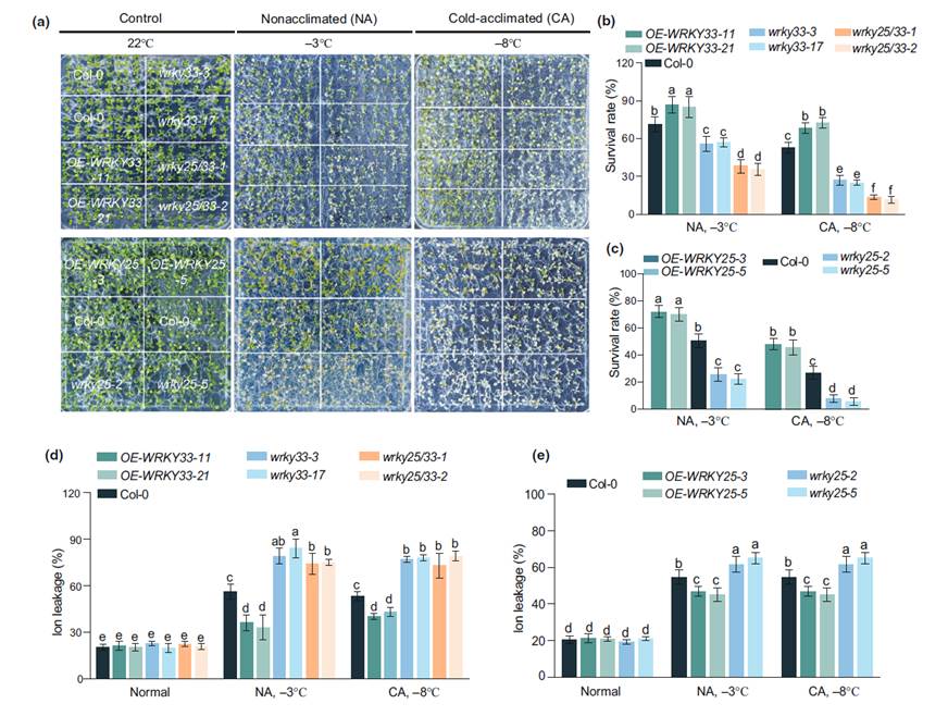 在这 22 个保守转录因子同源群中,研究人员重点关注了 WRKY25/26/33 这一组 WRKY 转录因子。系统发育和表达分析表明,该同源群在多个物种中均表现出明显的低温诱导表达。进一步在拟南芥中进行遗传功能研究发现,WRKY25 和 WRKY33 的突变体在低温条件下表现出更强的敏感性,而过表达植株则具有更高的耐寒能力(图2)。值得注意的是,这种调控作用并不依赖经典的 CBF 冷响应通路,提示 WRKY 转录因子可能参与了另一条平行的冷响应调控路径。