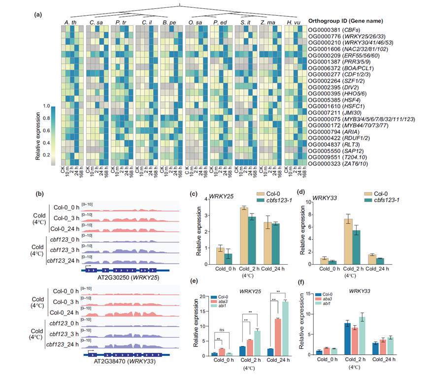 综上,本研究成功挖掘出被子植物保守冷响应转录因子同源群,明确了 “WRKY33-NAC032” 这一保守冷响应调控模块的作用机制,丰富了人们对被子植物冷适应进化策略的理解,为植物耐寒性状的遗传改良提供了新靶点。