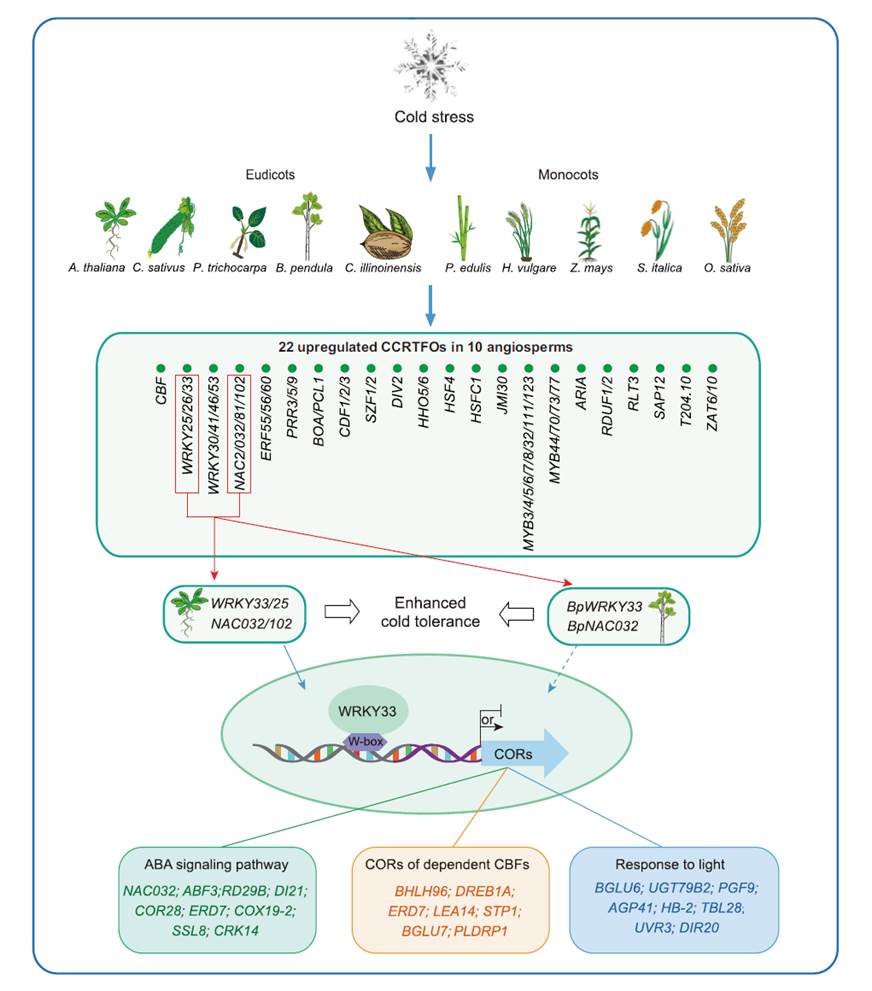 研究团队对10类代表性被子植物物种(包括5种双子叶植物和5种单子叶植物)进行比较基因组学和转录组学分析,鉴定出被子植物中保守的冷响应转录因子直系同源群。