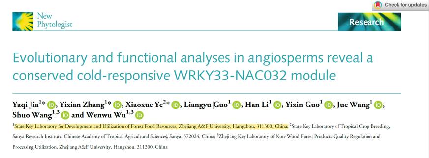近日,浙江农林大学森林食物资源挖掘与利用国家重点实验室吴文武教授团队以“Evolutionary and functional analyses in angiosperms reveal a conserved cold-responsive WRKY33-NAC032 module”为题,在《New Phytologist》(中科院1区Top,IF-5yr=10.3)发表研究论文,系统揭示了被子植物中保守存在的一个冷响应转录调控模块。
